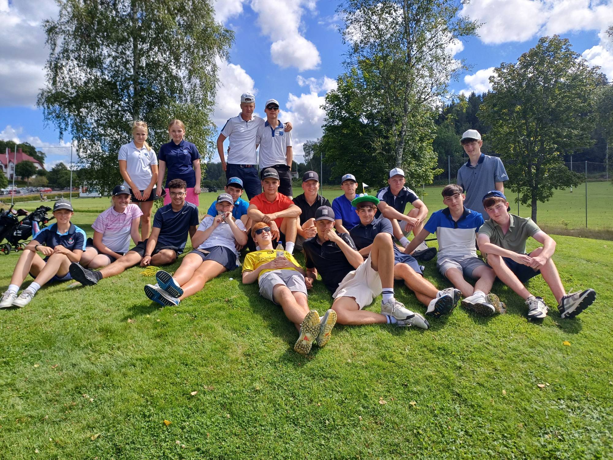 Redan 09.30 på söndags morgonen 27juli väntade ett gäng nervösa juniorer med föräldrar på Landvetter för att ta emot våra engelska vänner från West Lancashire i Liverpool. I år var det 10 juniorer (7 killar och tre tjejer) och deras två ledare Caryl och Phil som rest till Sverige för 5 dagars golf! Under sin vistelse här bor alla i värdfamiljer och för några av både våra och deras juniorer var det första gången man var med på detta äventyr vilket såklart var lite extra nervöst! Efter lunch på Herr Ober var det dags för spel på Kinnaborg. Första dagen spelas det 4boll bästboll där vi parar ihop de som bor tillsammans för att på så sätt lära känna varandra snabbare. Kul att kunna erbjuda spel på en banan i superfint skick och i ett fantastiskt sommarväder! Efter spelet var våra gäster trötta efter en mycket lång dag så det blev direkt hem till värdfamiljerna för middag och EM finalen i fotboll. Att de engelska tjejerna lyckades knipa guldet var såklart extra kul!
