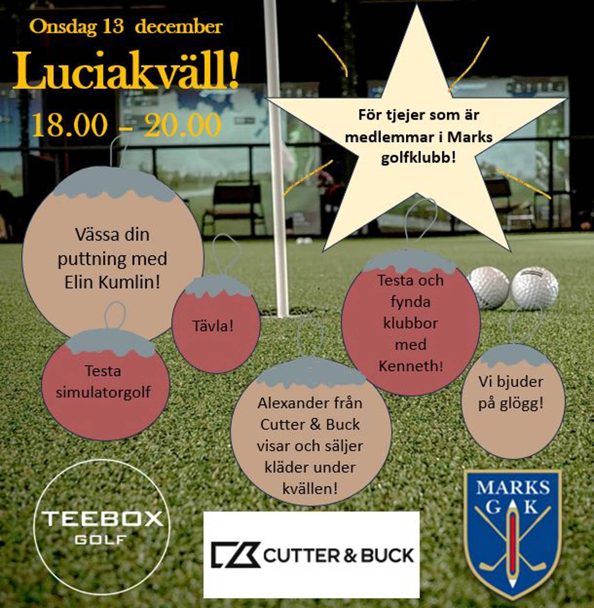 På självaste luciakvällen bjuder vi in till tjejkväll på Teebox Golf Indoor center! Elin Kumlin, klubbens egna golfproffs, bjuder på sina bästa puttningstips! Alexander från vårt kommande klädmärke Cutter & Buck (säsong 2024) kommer hit och visar fräscha golfkläder! Det kommer även finnas möjlighet att handla kläder på plats till bra priser! Kenneth finns här för dig som vill fynda klubbor!
